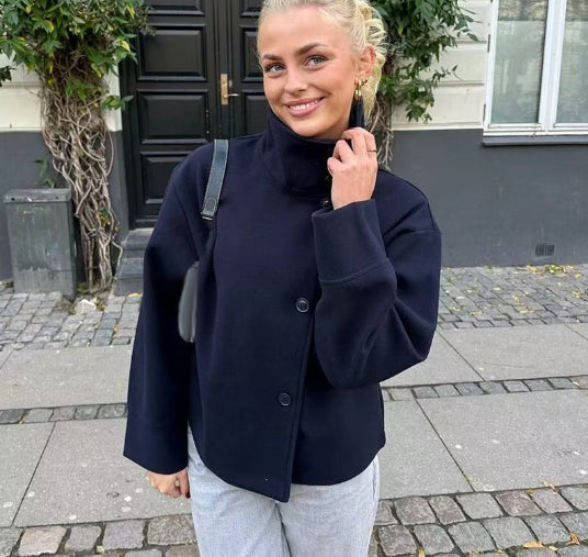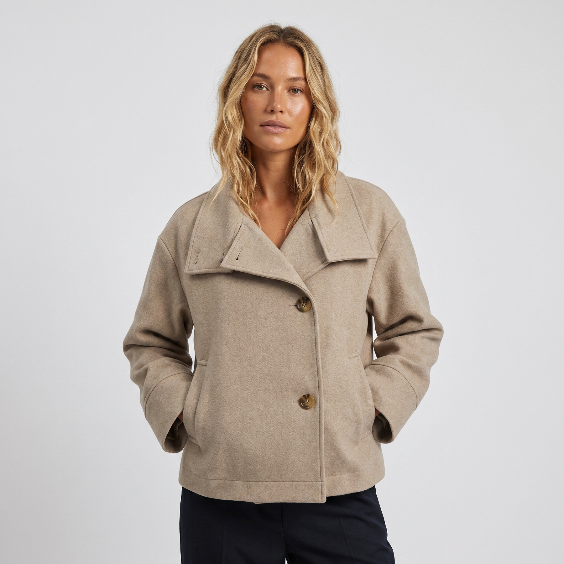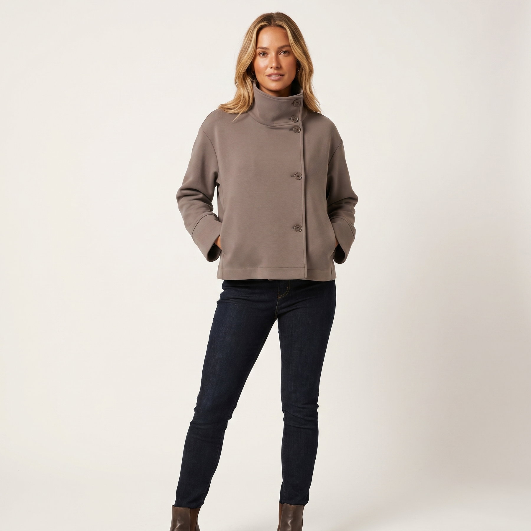 • Stand-up collar with button detailing
