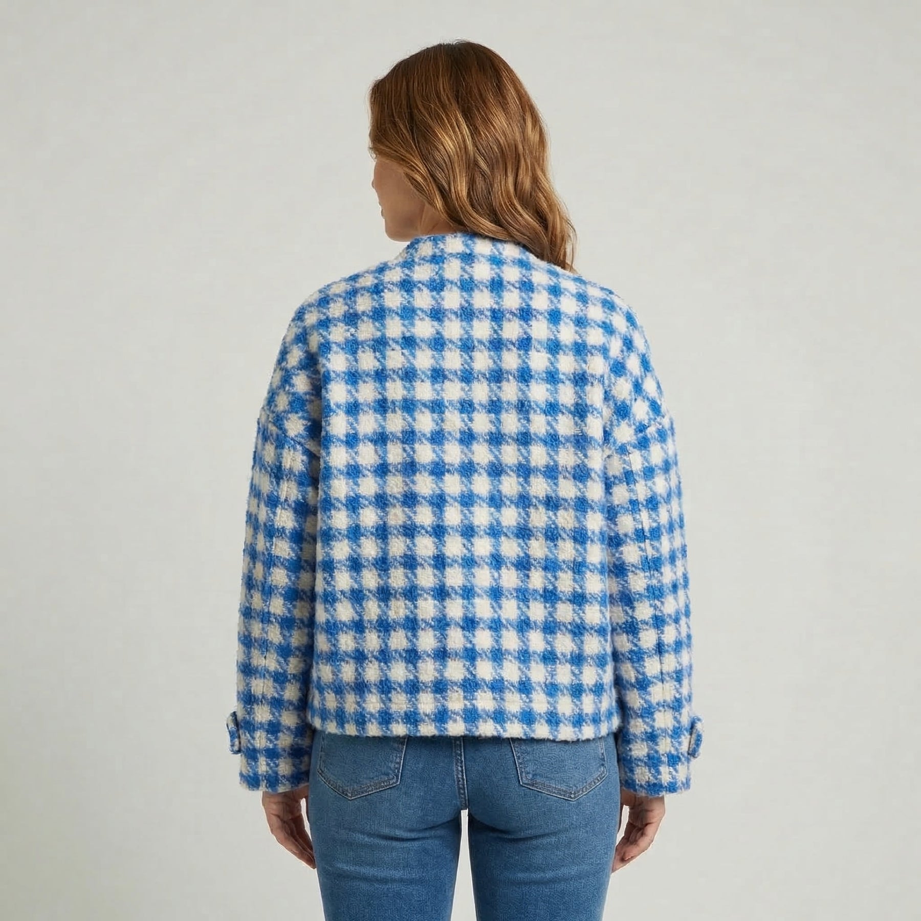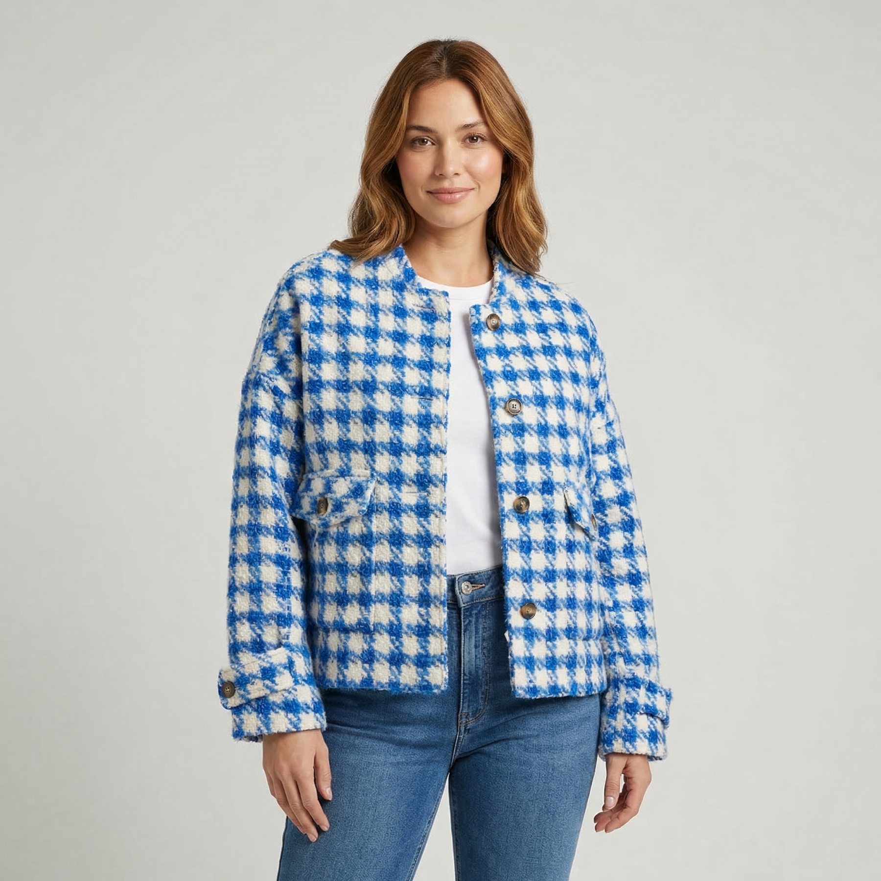 Enhance your wardrobe with this chic Women's Houndstooth Short Coat, featuring a vintage-inspired design and a modern collarless neckline.