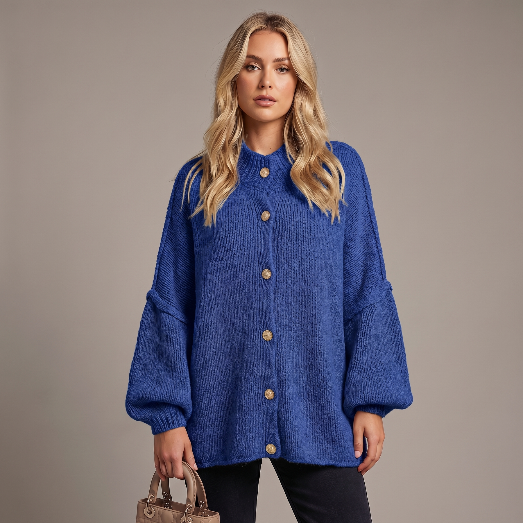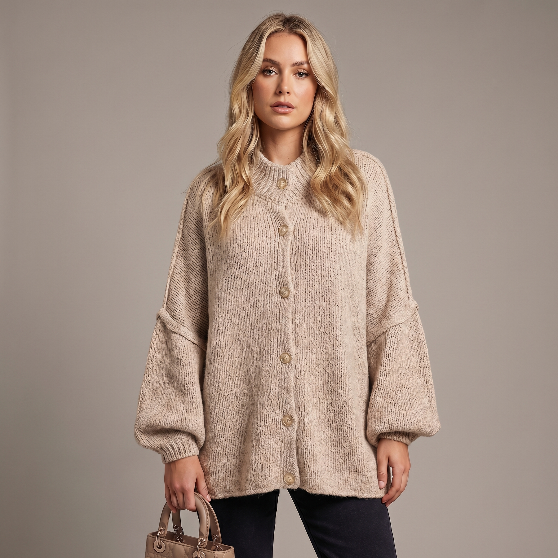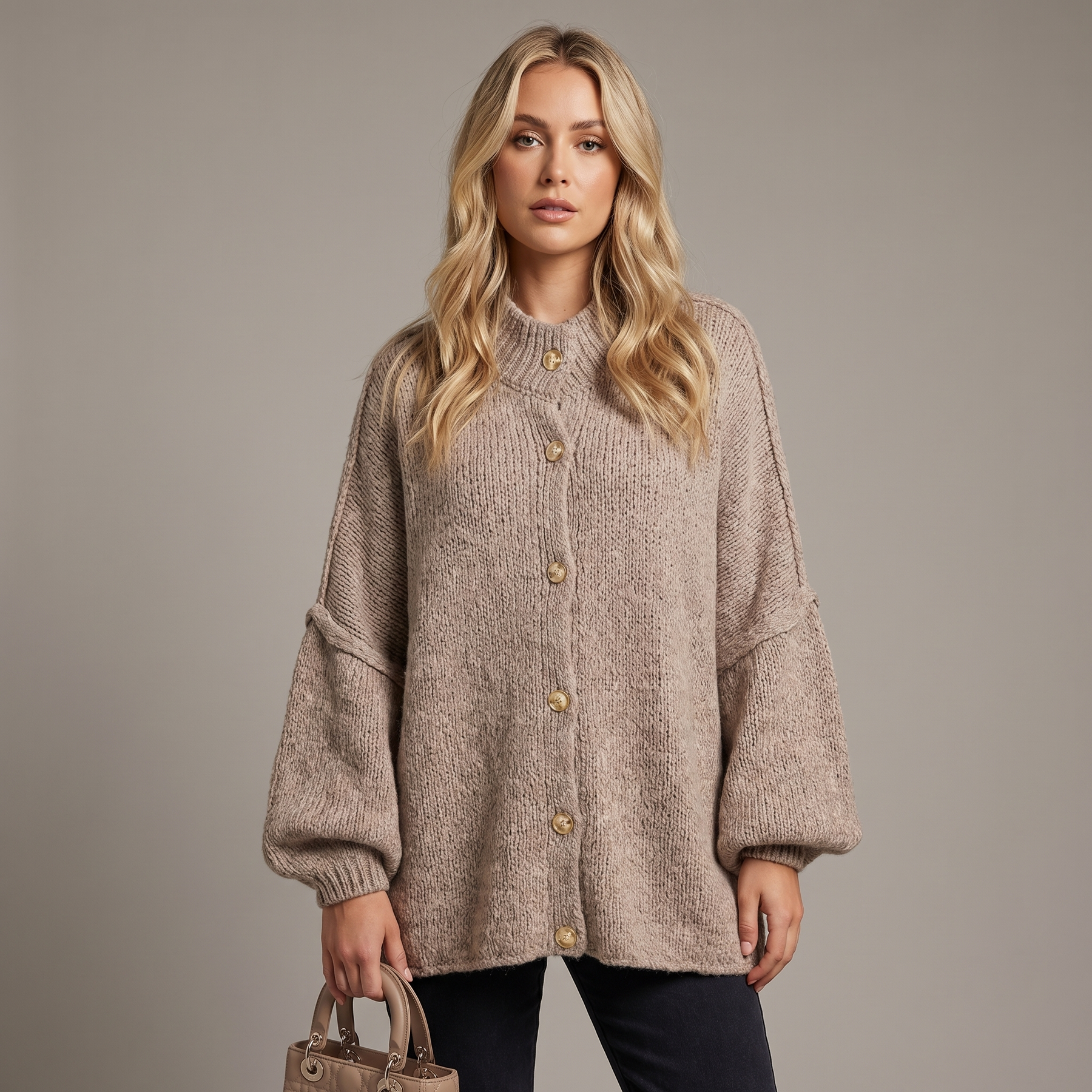 Experience effortless chic with this oversized knit cardigan featuring voluminous dolman sleeves.