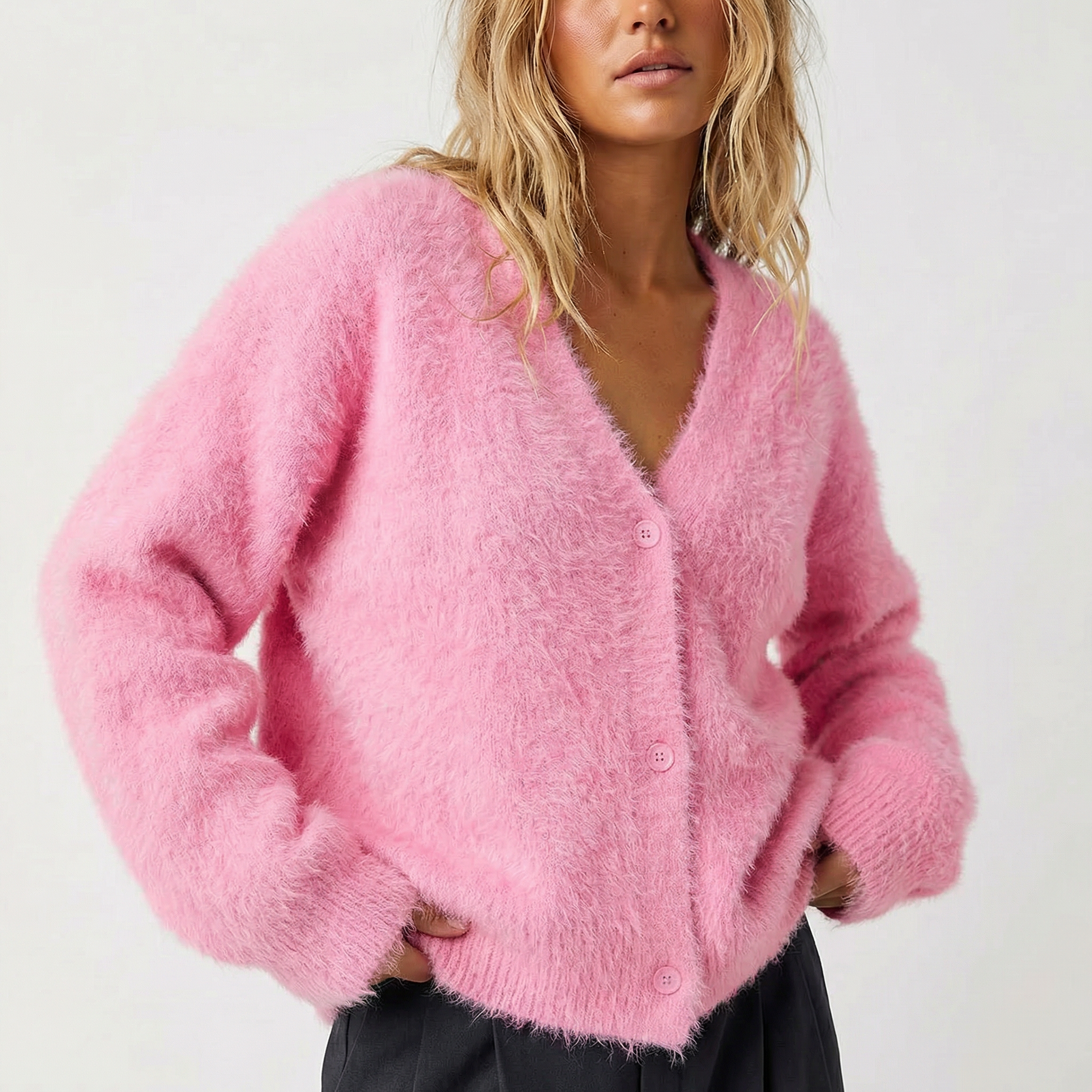 Women's Oversized Fuzzy Mohair V-Neck Button Down Knit Cardigan